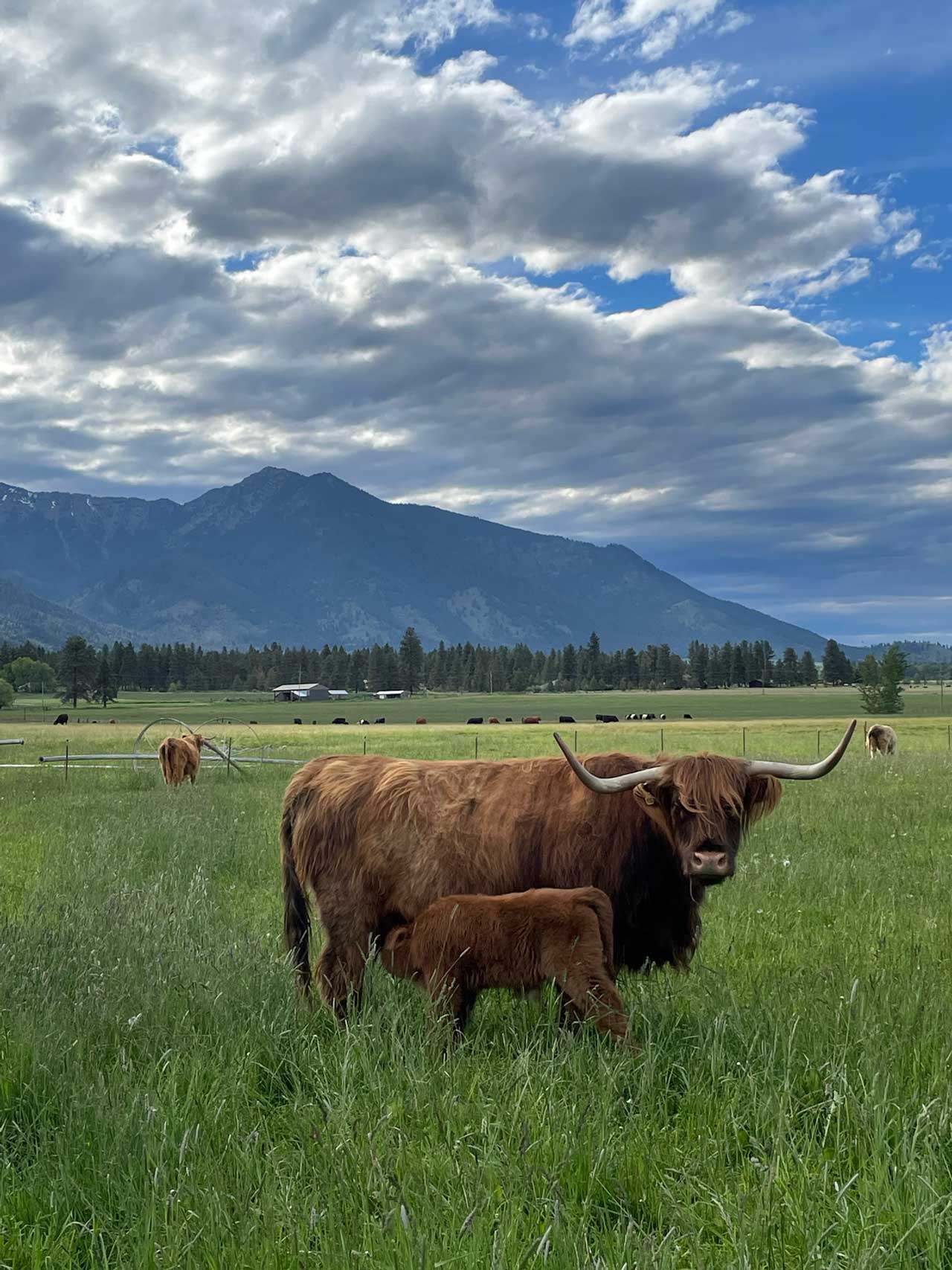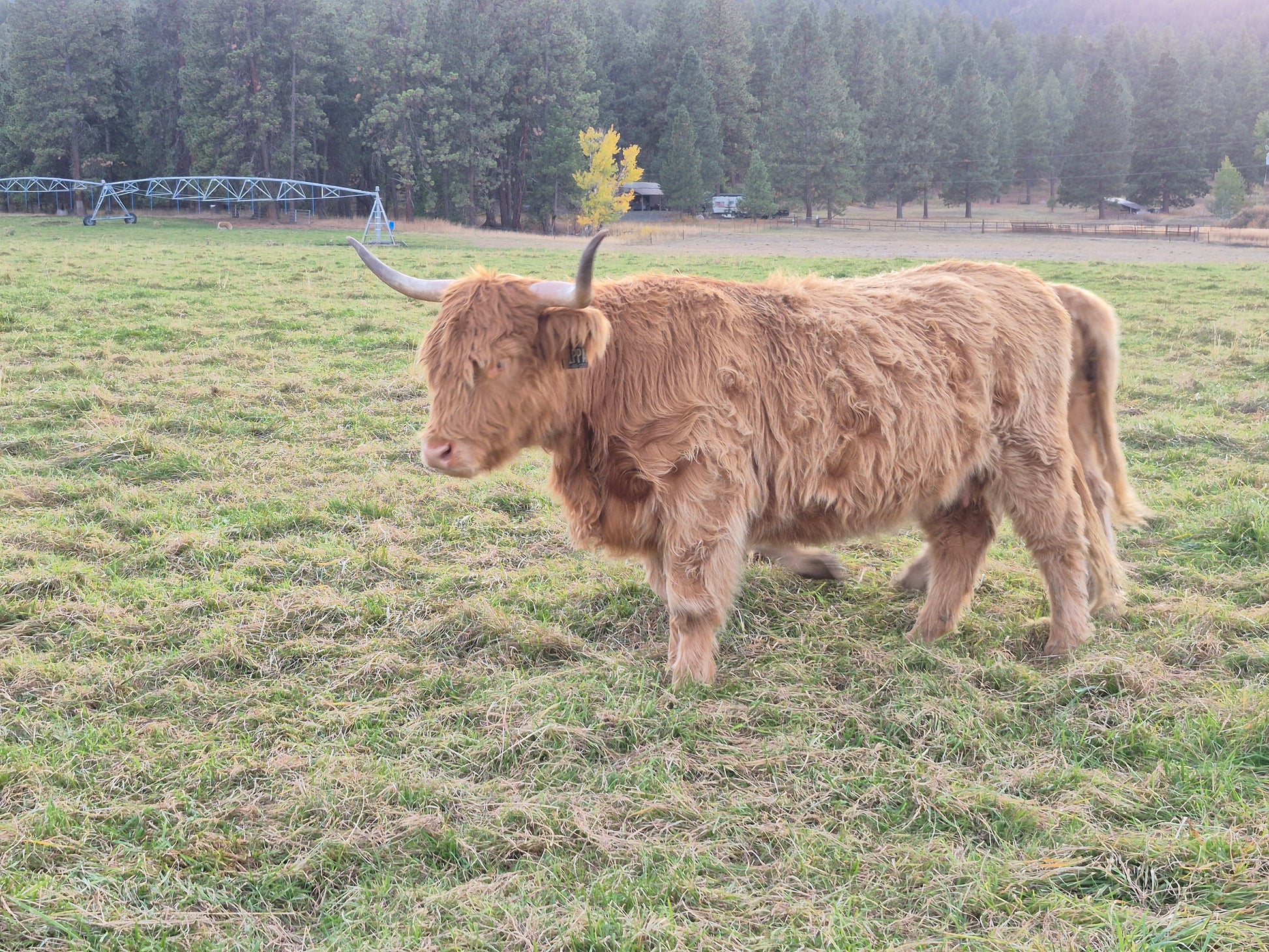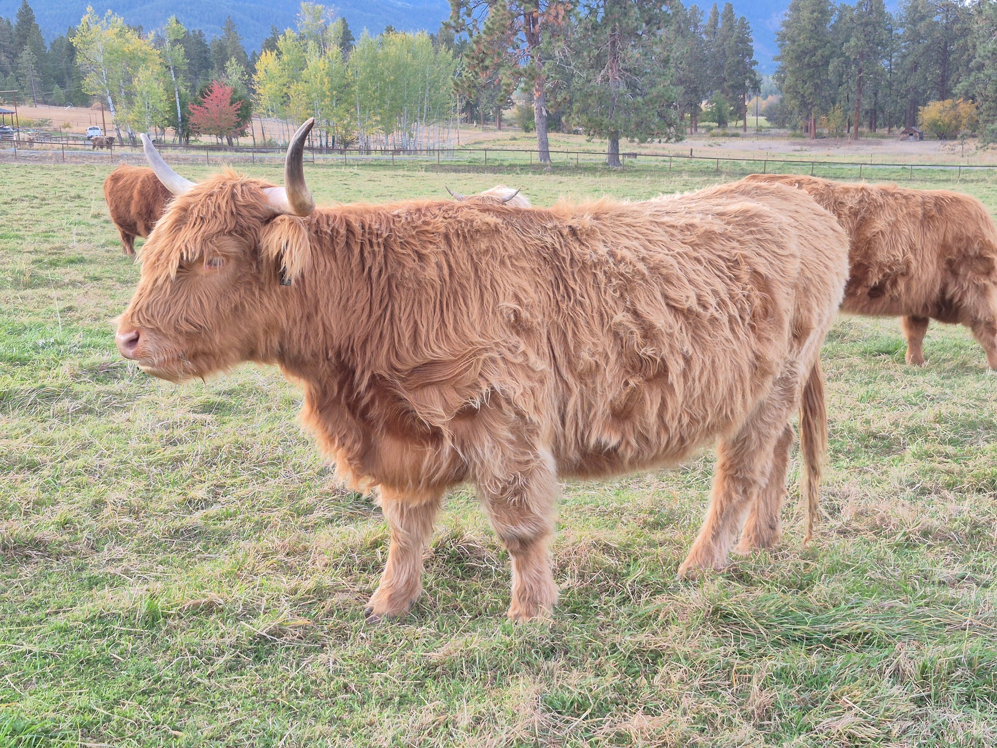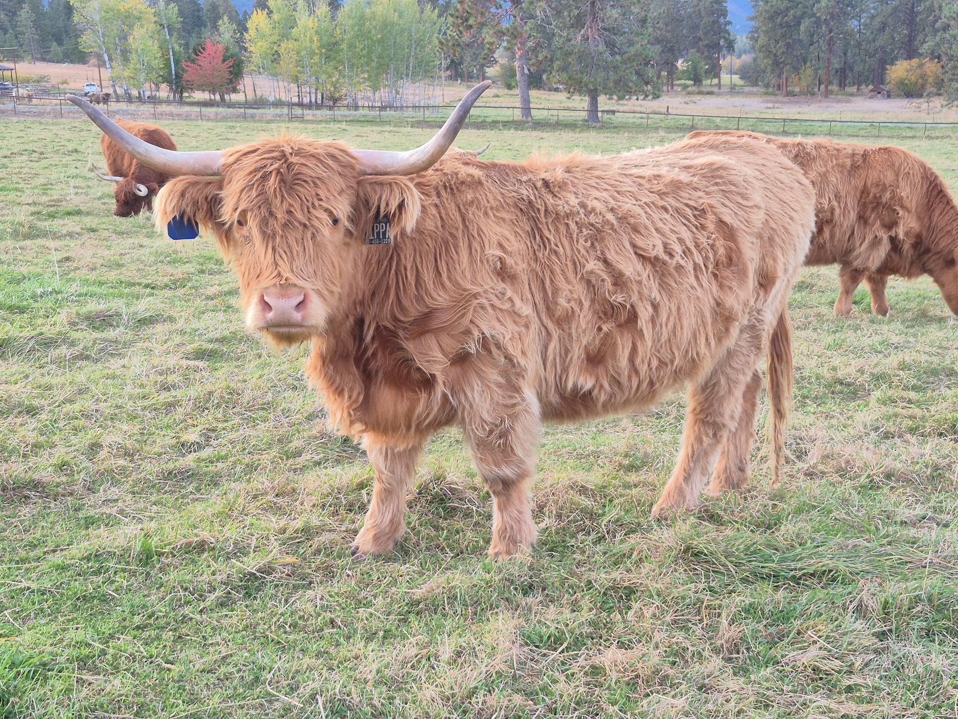 Pippa is a yellow cow, confirmed bread with a heifer calf, due 5/15/26. Her calf is sired by Dun, Rocksteady, or Lochmaddy. See our herdbook for more information on these bulls.