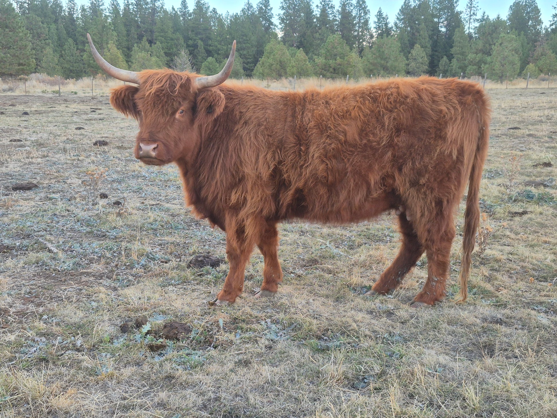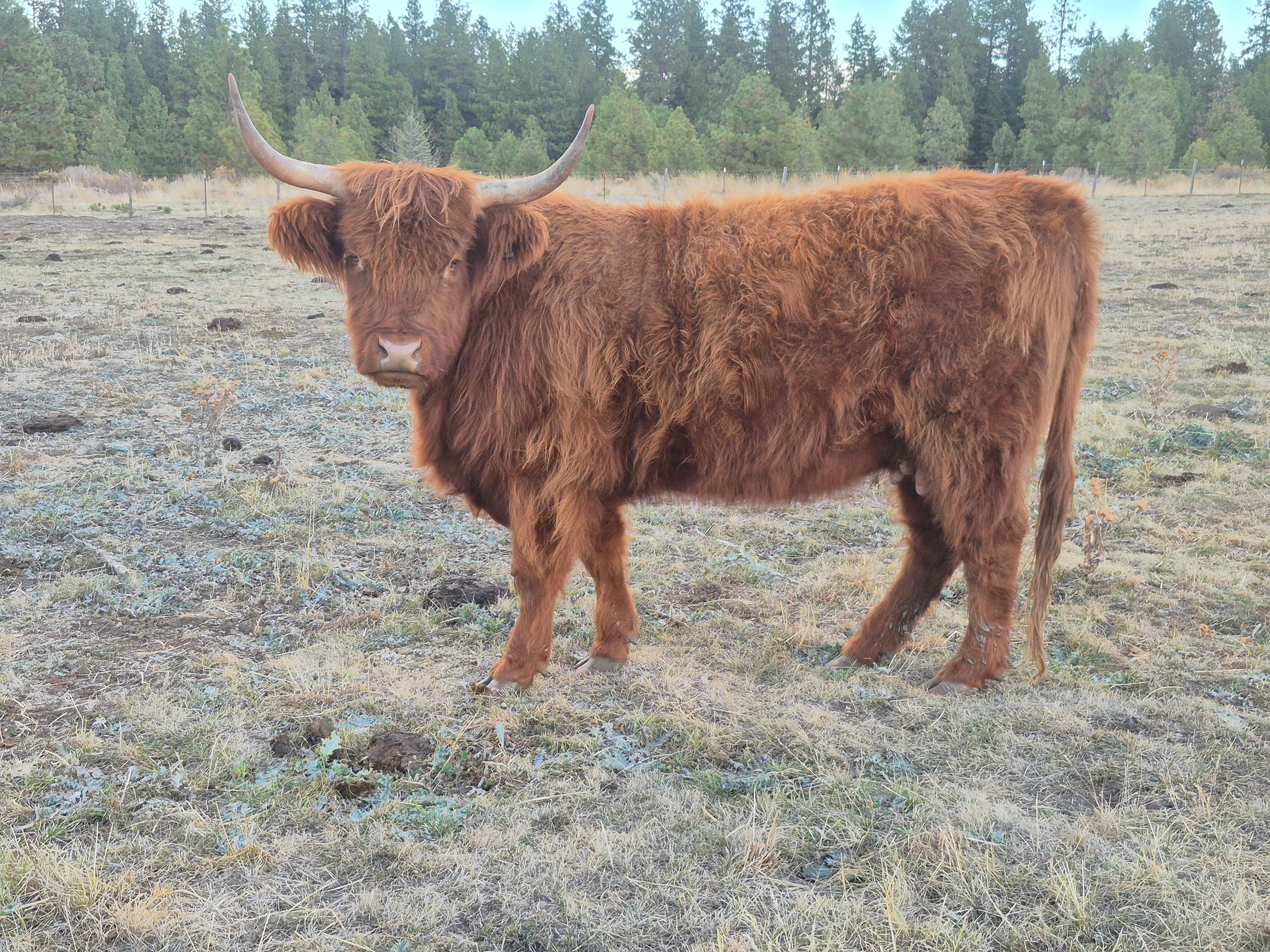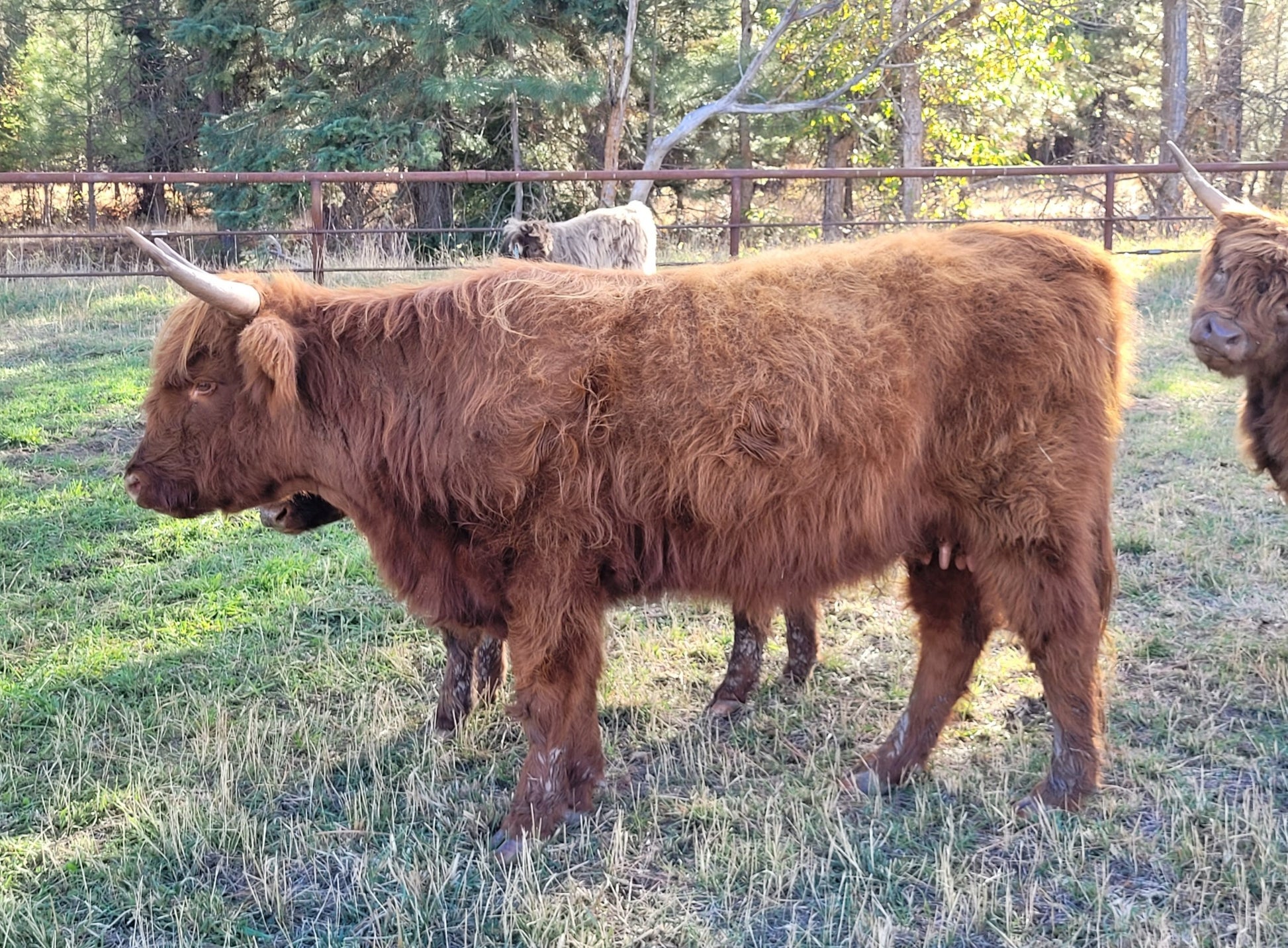 An unregistered, red cow, Teddita is super mellow and easy to work. She takes after her sire in looks and disposition. Teddita is confirmed bread (sex unknown), due 04/01/25. We have only chosen to sell her because she is unregistered.